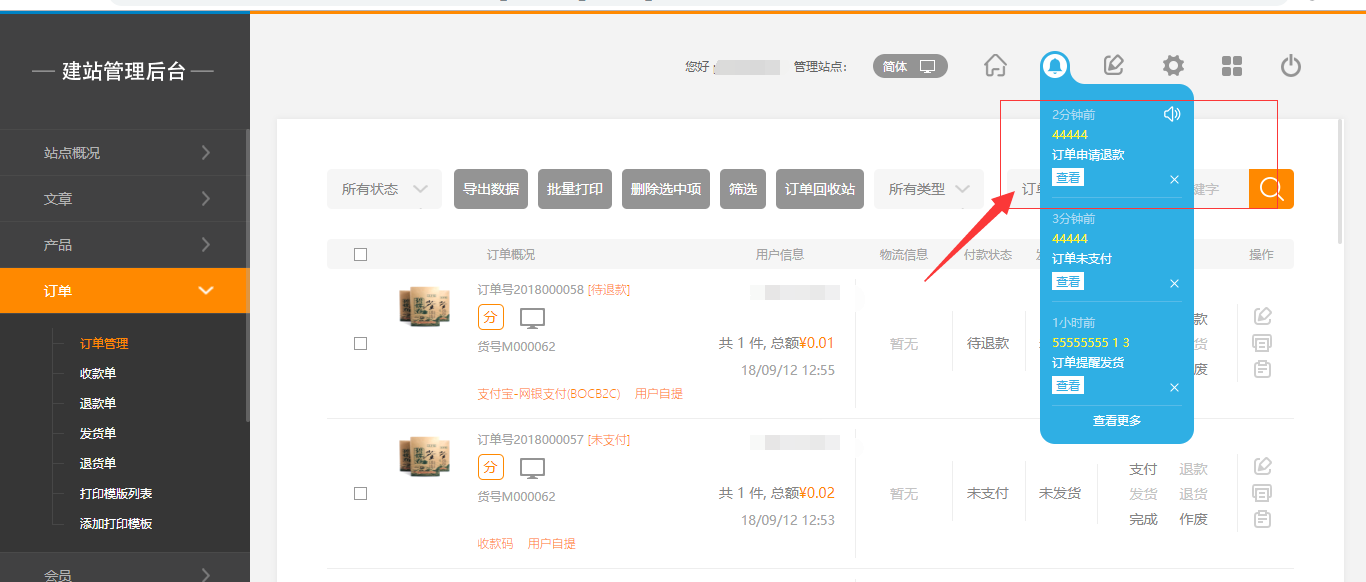 在后台,“电子商务设置”-“交易设置”中,有一个退款的操作,当开启该操作时,在前台用户页面可以直接申请退款,后台消息提醒中也会有相应的提示,点击“查看”即可(注:“退款”默认为关闭状态),如图所示: